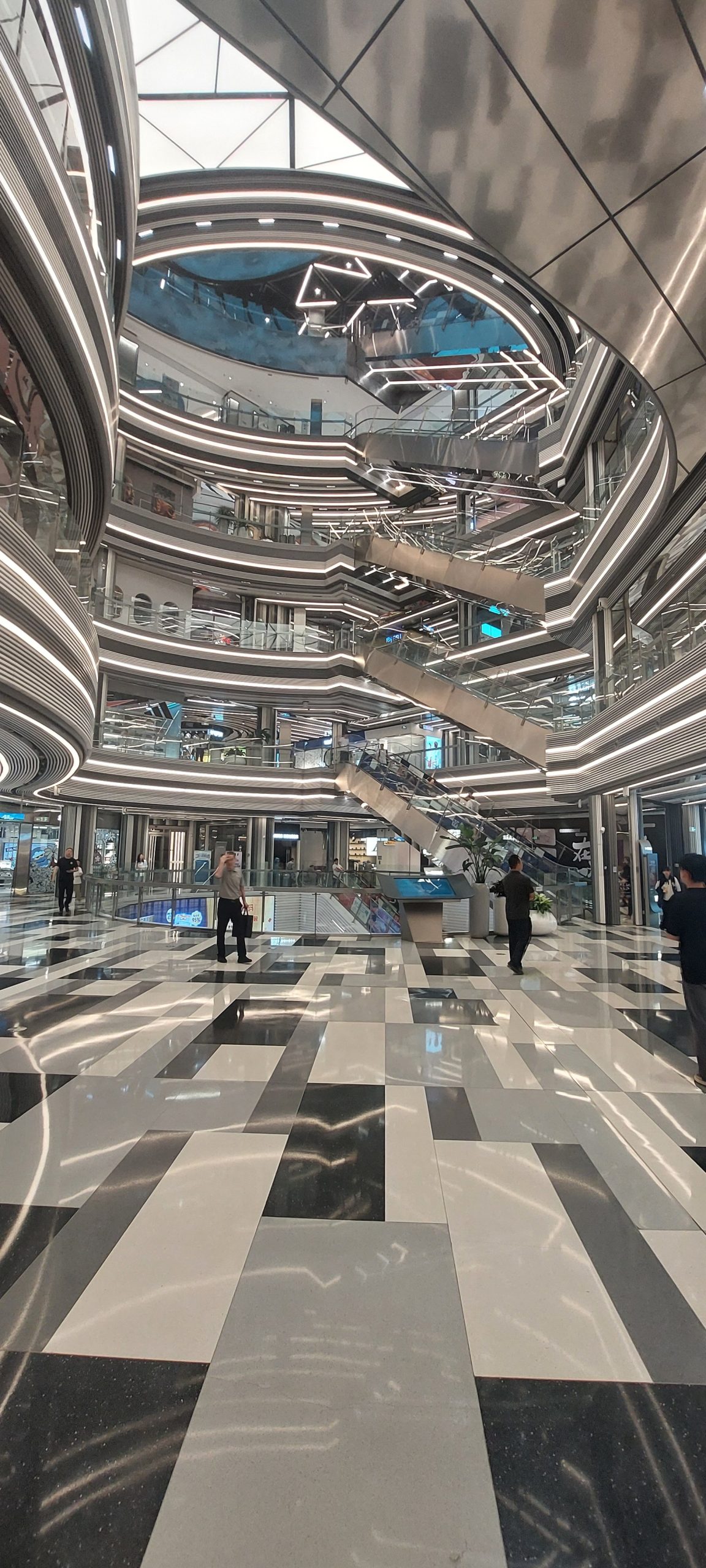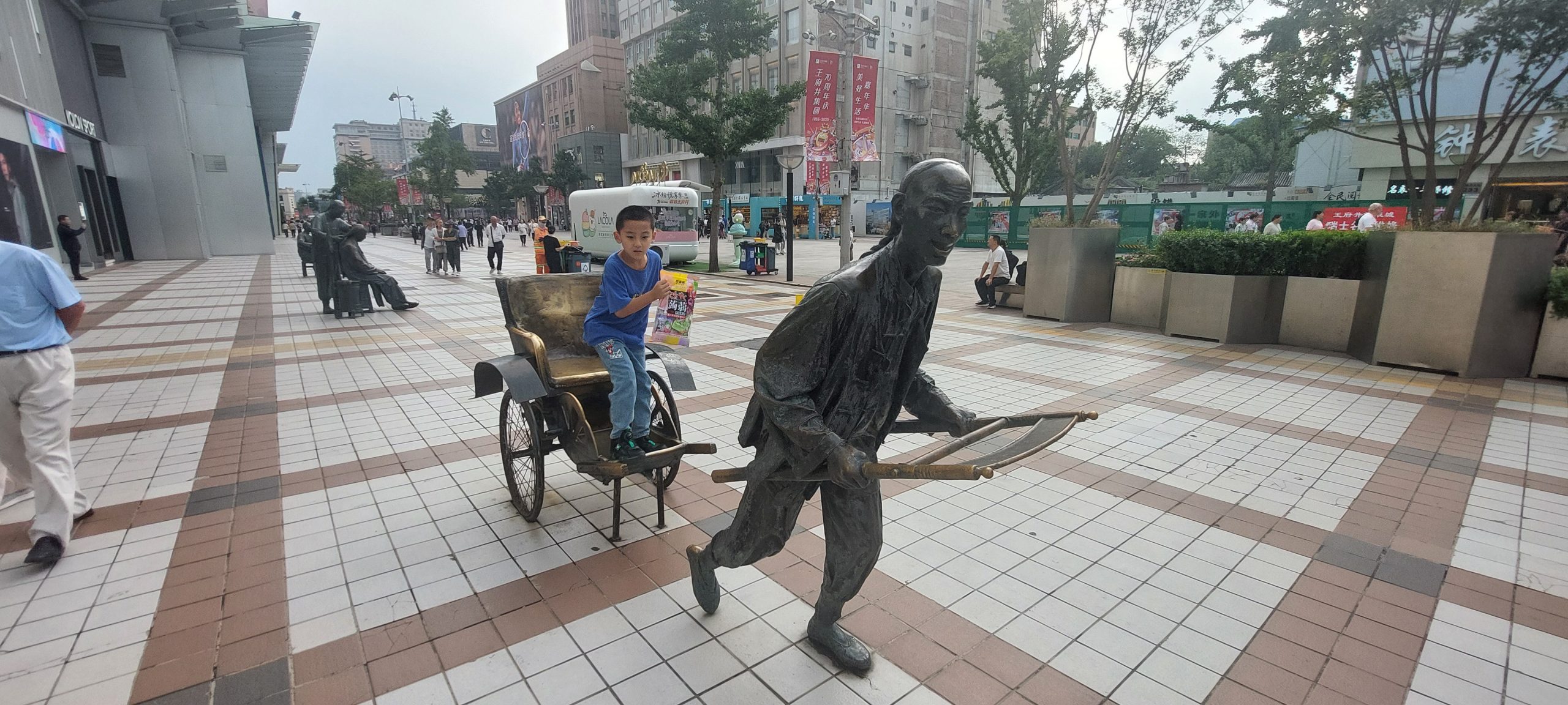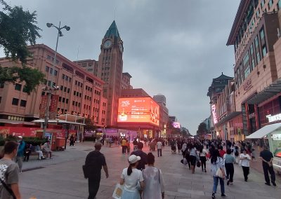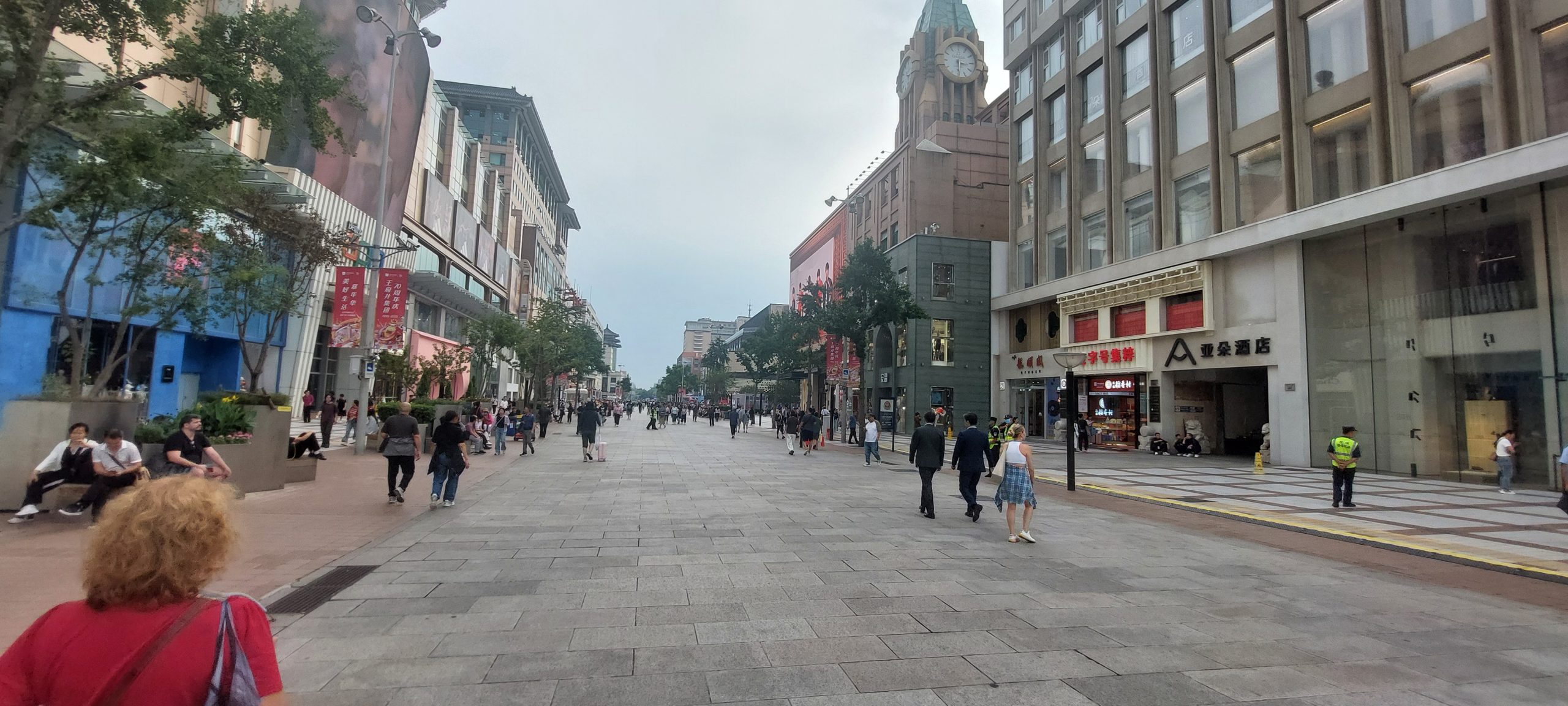 Finally, we went out after 14:30. We were told we were very close to Wangfujing Street, where old buildings had been transformed into shiny, bright shopping malls. We decided to walk there and see. It is a shopping district featuring trendy Western stores, as well as Chinese businesses. Shopping malls line both sides of the street, and people are walking around, crowding the Huawei and Apple stores. Apple had just announced its latest model, the 17, and a small crowd had gathered at the Apple store, looking at the new phone.