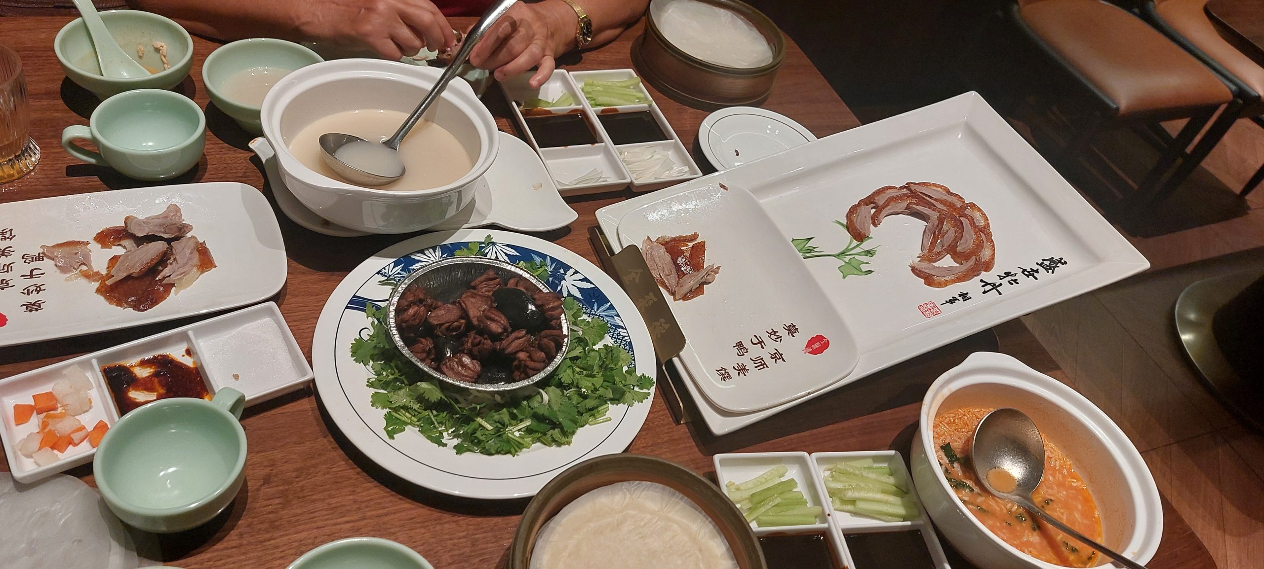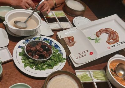 There is a way to eat the Peking duck. A chef comes to your table and cuts the duck. However, ours stayed at the door of the section we were eating in, but was still visible. He cuts the duck to serve the crispy, yet tender, skin first. It is served with a tray of sugar dips. You pick up the skin, dip it into the sugar, and eat. Then the rest of the meat, cut into small pieces, comes. There are small pancake-like breads that are served with the duck. You pick the meat, dip it in the sauce, make a small sandwich with the meat inside, and eat. We didn’t know this protocol, but we managed to survive. Duck meat was very oily, which made it easy to eat. We also had soup and duck hearts. I loved the duck hearts; however, I could not finish the whole plate.