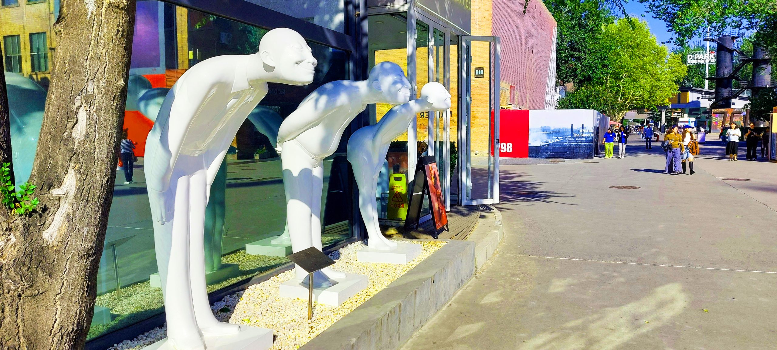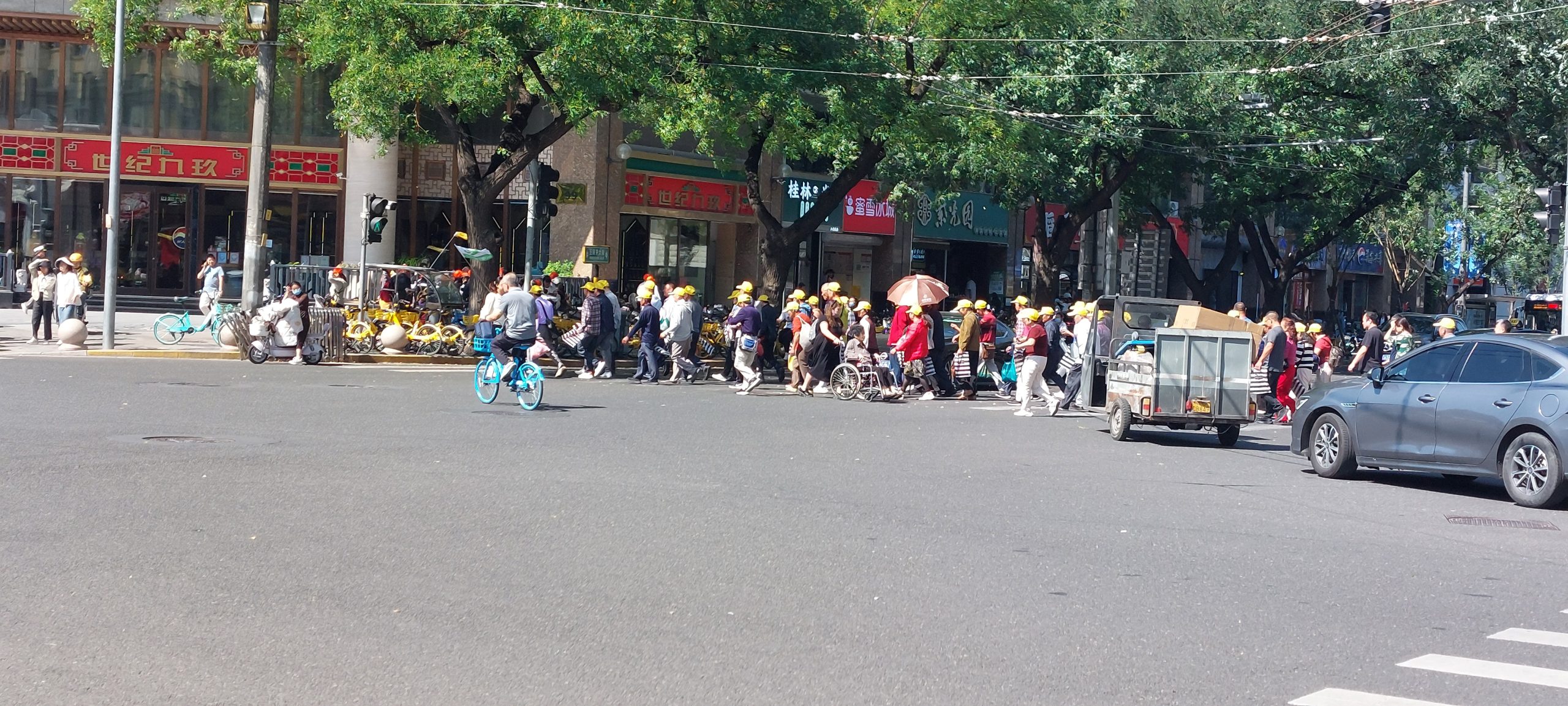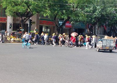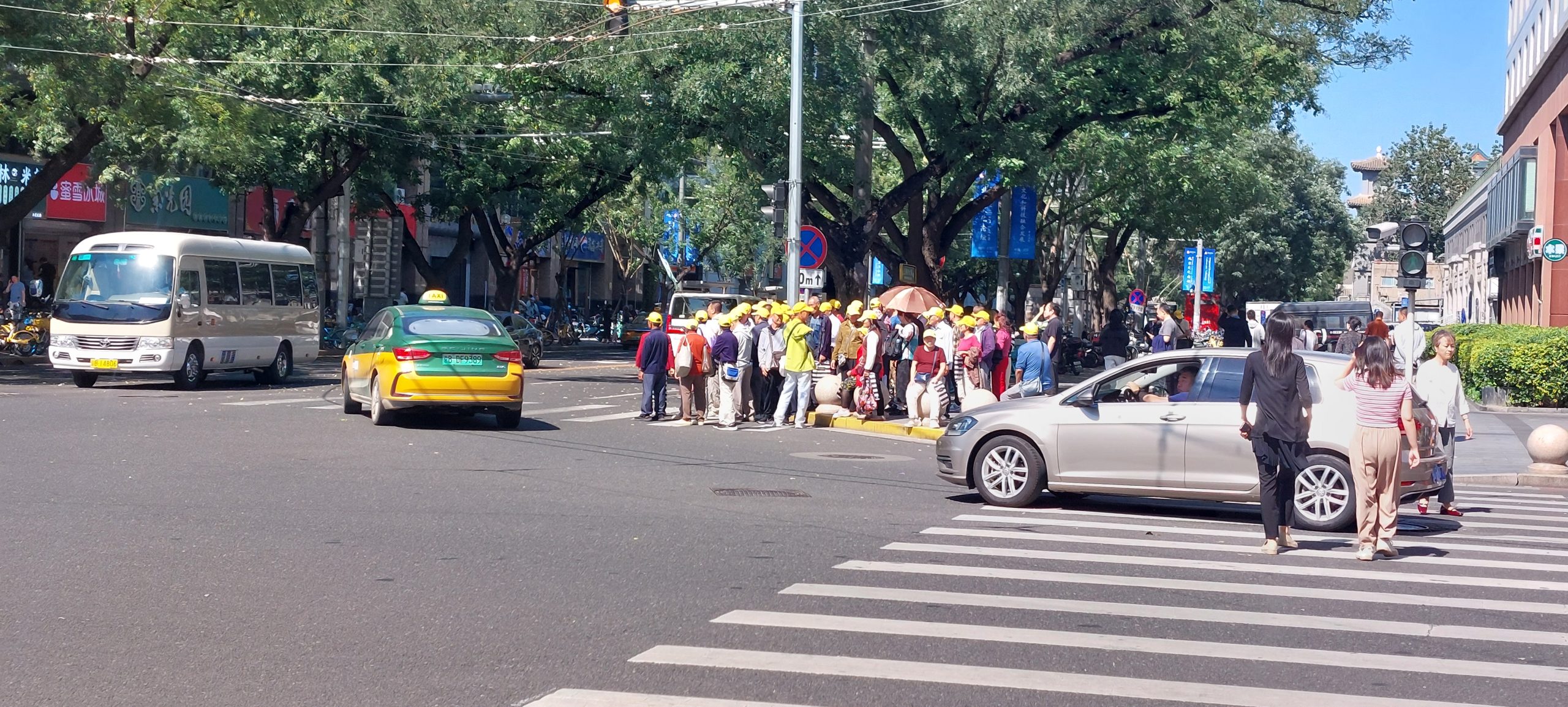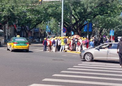This became one of the hardest things we faced in Beijing.  We are accustomed to simply signaling a passing taxi, and the driver often disregards all laws, rules, regulations, safety, and courtesy to stop and pick up the passengers.  Not so in Beijing.  We spent about an hour trying to get a cab.  Our first mistake was going to a busy intersection and trying to get a cab there.  After noticing that no taxi was stopping, we decided to walk down the boulevard to see if we could stop one away from the intersection.  No matter which side of the street we tried, the cabs were determined to go from the farthest lane from us, close to the boulevard’s green divider.  Nearly all drivers ignored my theatrical gestures and didn’t even respond.  Very few raised their hands in a negative gesture, indicating not even to approach.  We sat by the road. Gulden tried downloading a taxi-hailing app, but that too did not work, as it required registering a phone number.  We walked back to the intersection, where there were more cabs, to no avail.  We noticed a large hospital near us and thought we could catch one at the entrance if we ever got the chance.  While walking there, I saw a taxi illegally parked in a driveway. However, as I was running towards it, the driver, having just picked up his lunch from the restaurant, sped away to avoid being ticketed.  We saw a group of people standing by the side of the road with their faces in their phones, also trying to read the license plates.  The cabs were coming to pick them up after being summoned from an app like Uber.  After waiting a while, and everybody who was waiting got into their taxis, I saw a hesitating cab and grabbed it.  Exhausted, we showed the driver the address of the 798 Art Pavilion.  He recognized it and turned on the meter.