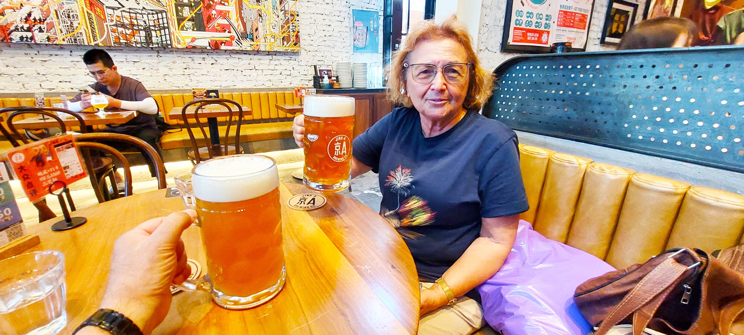 First, we ordered the beer using translation apps and the waiter’s help.  We did not like the amount (350cc) and asked for a larger glass, and he casually said a liter, which we agreed.  When the beer came, it was in a huge liter glass.  By the time we stopped laughing about the beer, my burger, which had a “sweet and sour soup taste,” came.  It was delicious and large.  Gulden’s pizza came too, and we finished it all by washing it down with the beer.  We couldn’t finish the beer.