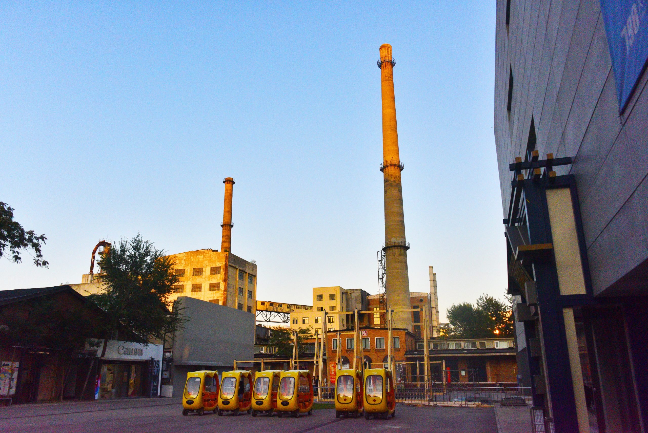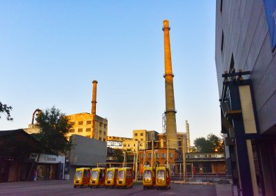 When the Olympics happened in Beijing in 2008, the government decided to clean up the air, and to improve the air quality, they seriously implemented strict measures. They planted trees in the whole city and the whole country.  Heating was replaced with natural gas, motor vehicles were converted to electric, cars were allowed to traffic depending on their plate numbers, and polluting factories were updated to modern methods and were moved outside the cities.  As a part of this plan, this weapons factory was shut down and artists moved in.